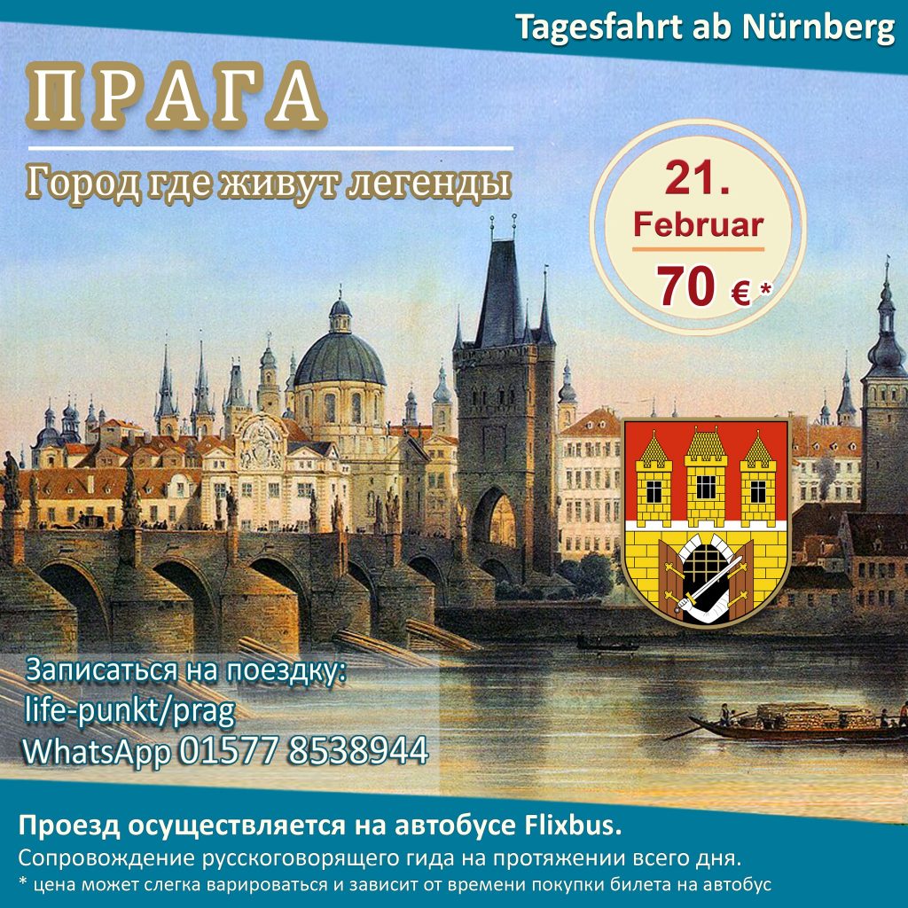 ПРАГА | Однодневная прогулочно-экскурсионная поездка в субботу, 21.02.2026. Стоимость поездки: 70 €. Проезд осуществляется на автобусе. Экскурсионное сопровождение на русском языке на протяжении всего дня. Выезд из Нюрнберга.